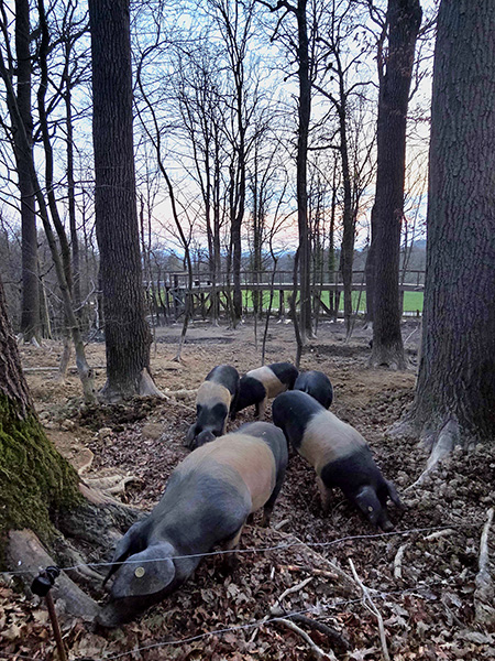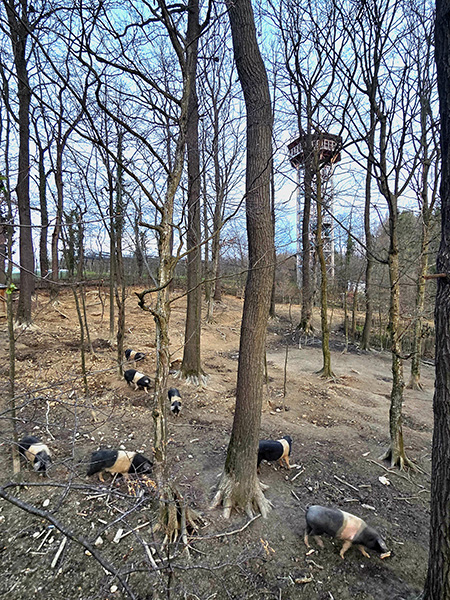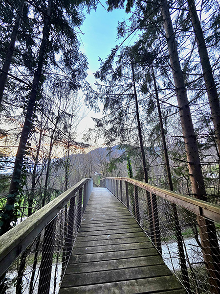Posebnost Pomone je edinstvena učna pot, kjer se sprehodimo po lesenem mostu, dvignjenem visoko nad tlemi, ki nas popelje naravnost skozi krošnje dreves. Med potjo lahko opazujemo tudi živali, med njimi krškopoljske prašiče, in spoznamo zanimive trajnostne pristope, kot je akvaponika – način pridelave zelenjave, ki je povezan z vzrejo rib. Na kmetiji gojijo več vrst jesetrov, njihovo “vodno zgodbo” pa še širijo. Ko se dan prevesi v večer, dobi sprehod po poti povsem novo, prav čarobno vzdušje.